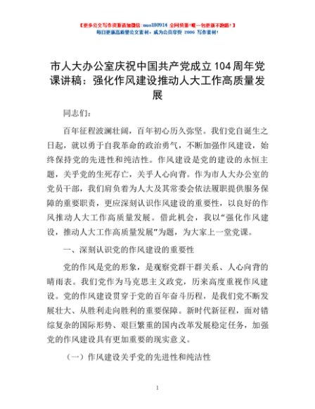 市人大办公室庆祝中国共产党成立104周年党课讲稿:强化作风建设 推动人大工作高质量发展