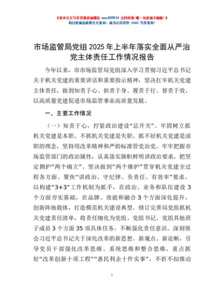 / 市场监管局党组2025年上半年落实全面从严治党主体责任工作情况报告