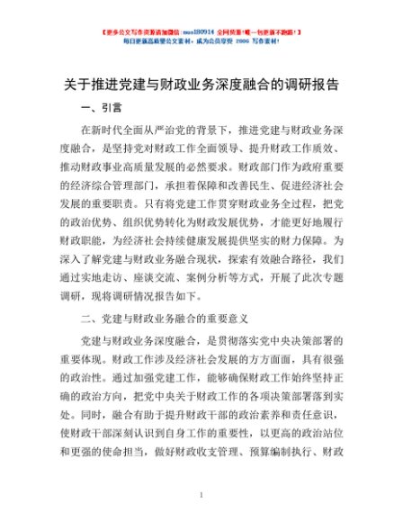 / 关于推进党建与财政业务深度融合的调研报告