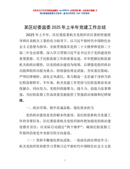 / 某区纪委监委2025年上半年党建工作总结