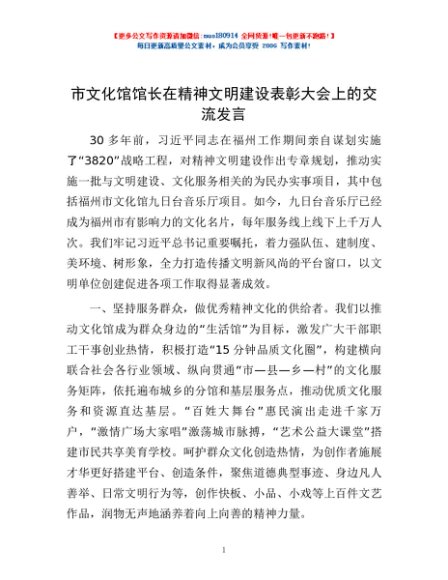 / 市文化馆馆长在精神文明建设表彰大会上的交流发言