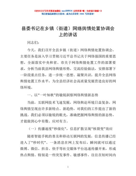/ 县委书记在乡镇(街道)网络舆情处置协调会上的讲话
