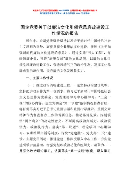/ 国企党委关于以廉洁文化引领党风廉政建设工作情况的报告