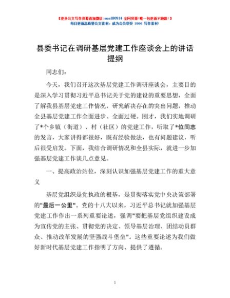 / 县委书记在调研基层党建工作座谈会上的讲话提纲