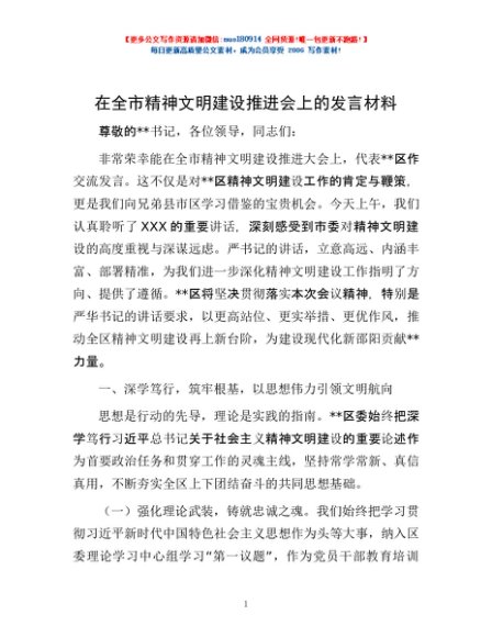 / 在全市精神文明建设推进会上的发言材料