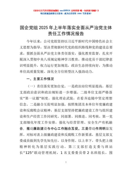 / 国企党组2025年上半年落实全面从严治党主体责任工作情况报告