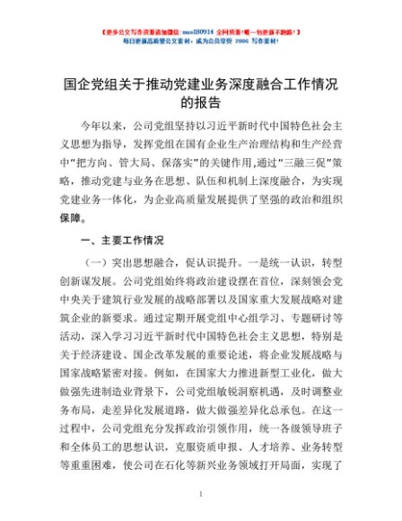 / 国企党组关于推动党建业务深度融合工作情况的报告