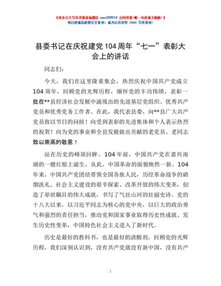/ 县委书记在庆祝建党104周年“七一”表彰大会上的讲话