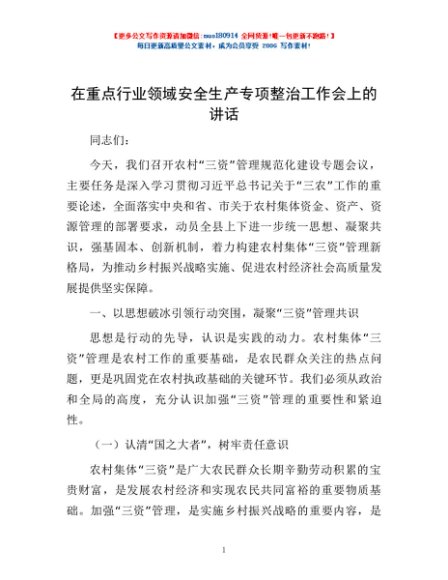 / 在重点行业领域安全生产专项整治工作会上的讲话
