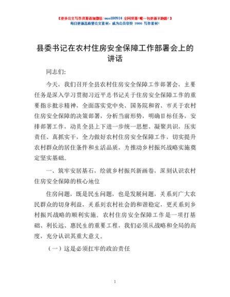 / 县委书记在农村住房安全保障工作部署会上的讲话