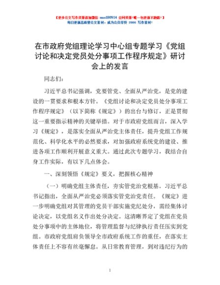 / 在市政府党组理论学习中心组专题学习《党组讨论和决定党员处分事项工作程序规定》研讨会上的发言