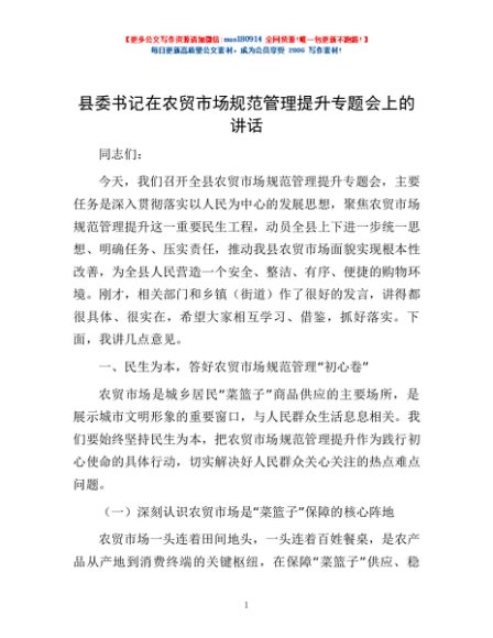 / 县委书记在农贸市场规范管理提升专题会上的讲话