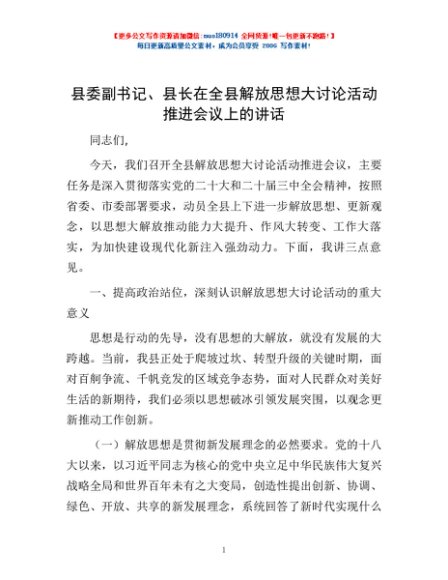 / 县委副书记、县长在全县解放思想大讨论活动推进会议上的讲话