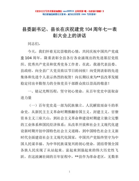 / 县委副书记、县长在庆祝建党104周年七一表彰大会上的讲话
