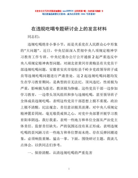 / 在违规吃喝专题研讨会上的发言材料
