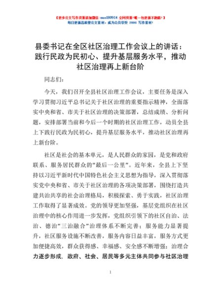/ 县委书记在全区社区治理工作会议上的讲话:践行民政为民初心、提升基层服务水平,推动社区治理再上新台阶