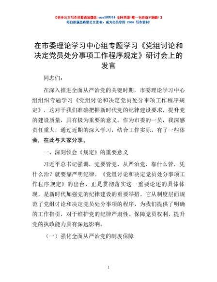 / 在市委理论学习中心组专题学习《党组讨论和决定党员处分事项工作程序规定》研讨会上的发言