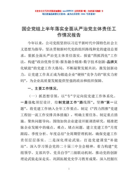 / 国企党组上半年落实全面从严治党主体责任工作情况报告
