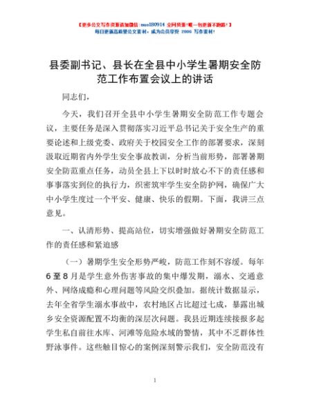 / 县委副书记、县长在全县中小学生暑期安全防范工作布置会议上的讲话