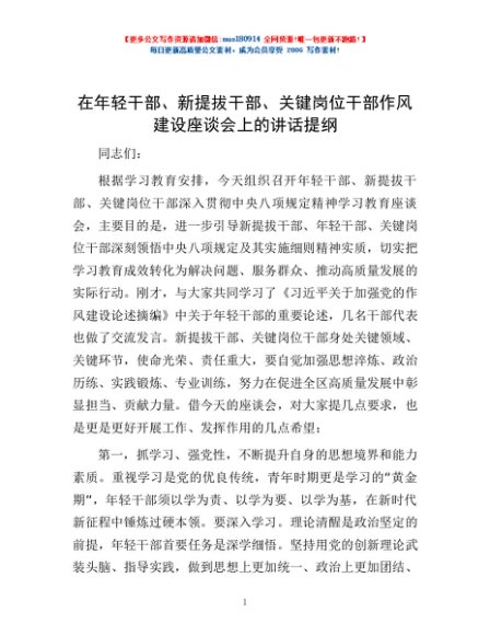 / 在年轻干部、新提拔干部、关键岗位干部作风建设座谈会上的讲话提纲