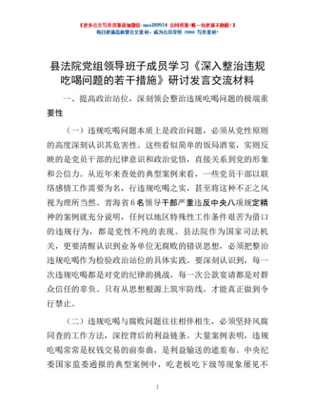 / 县法院党组领导班子成员学习《深入整治违规吃喝问题的若干措施》研讨发言交流材料