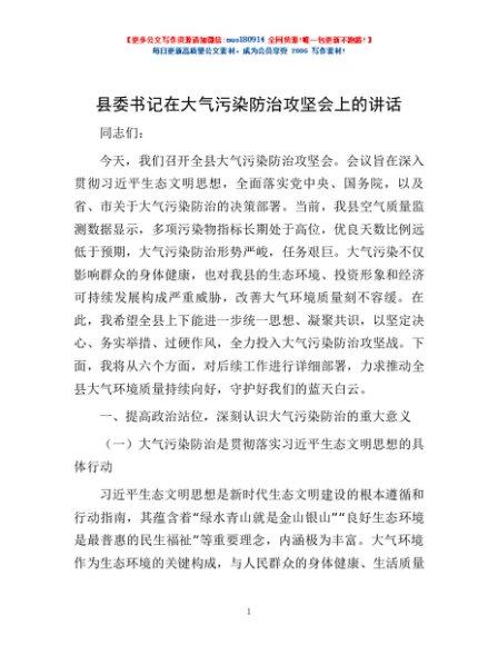 / 县委书记在大气污染防治攻坚会上的讲话