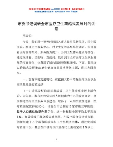 / 市委书记调研全市医疗卫生跨越式发展时的讲话