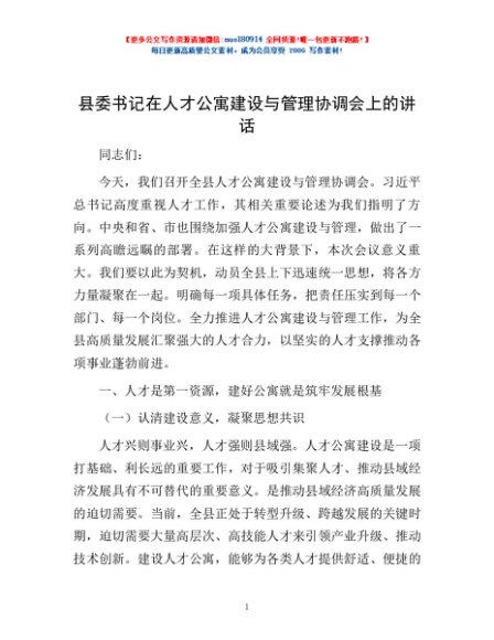 / 县委书记在人才公寓建设与管理协调会上的讲话