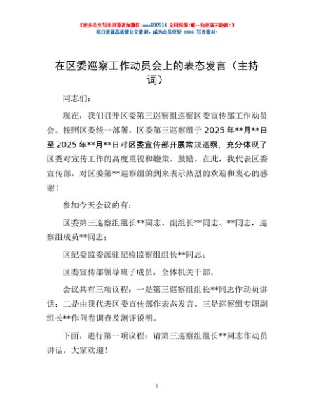 / 在区委巡察工作动员会上的表态发言(主持词)