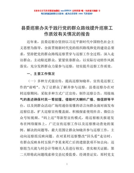/ 县委巡察办关于践行党的群众路线提升巡察工作质效有关情况的报告
