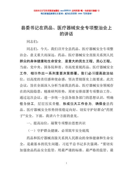 / 县委书记在药品、医疗器械安全专项整治会上的讲话