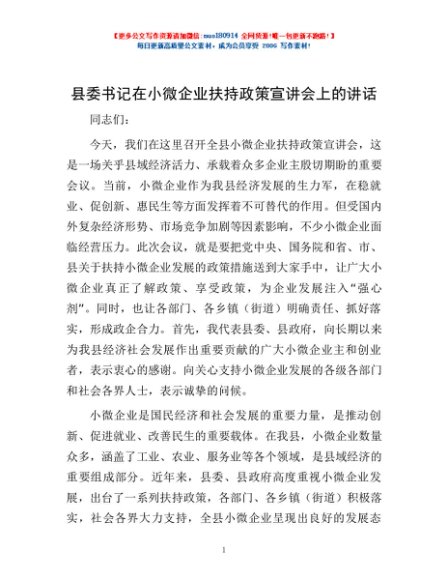 / 县委书记在小微企业扶持政策宣讲会上的讲话