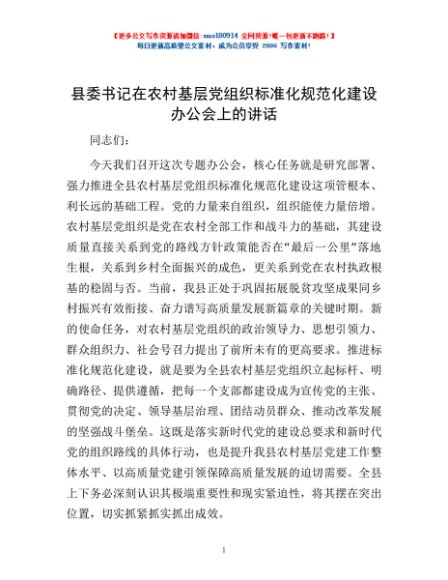 / 县委书记在农村基层党组织标准化规范化建设办公会上的讲话