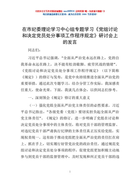 / 在市纪委理论学习中心组专题学习《党组讨论和决定党员处分事项工作程序规定》研讨会上的发言