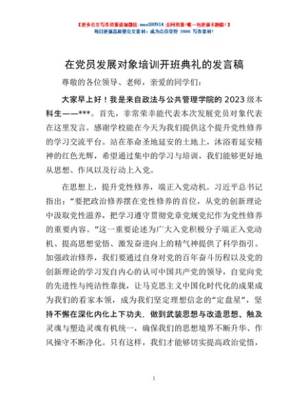 / 在党员发展对象培训开班典礼的发言稿