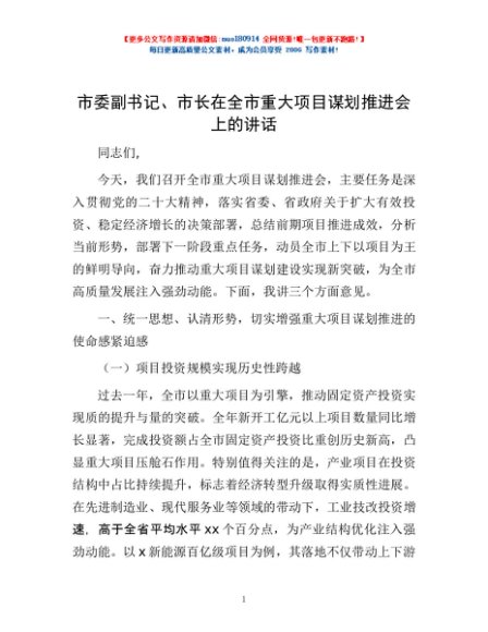 / 市委副书记、市长在全市重大项目谋划推进会上的讲话