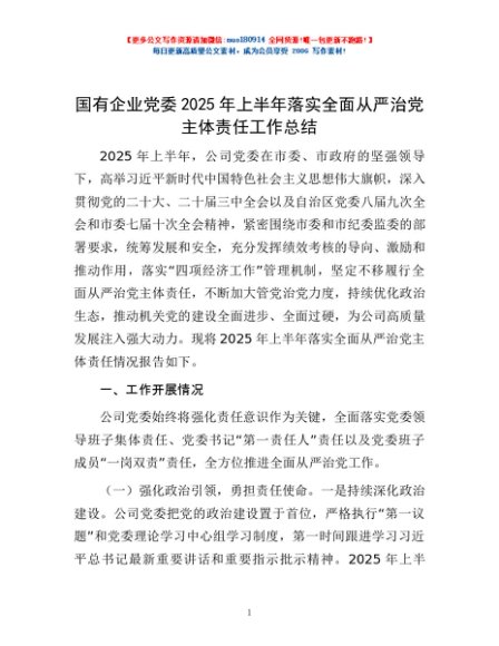 / 国有企业党委2025年上半年落实全面从严治党主体责任工作总结