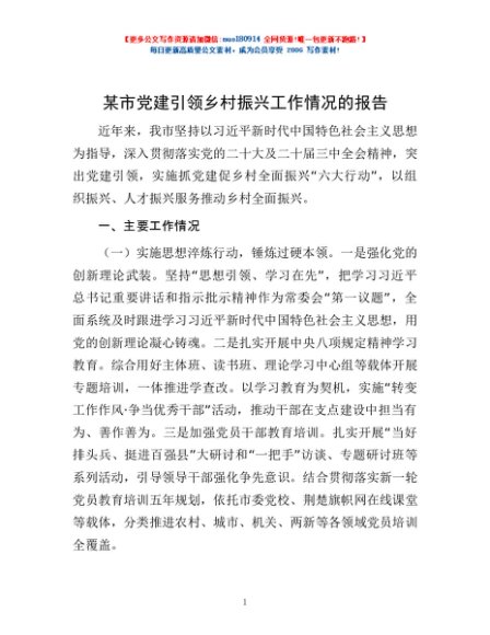 / 某市党建引领乡村振兴工作情况的报告