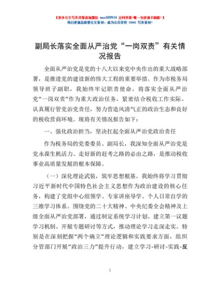 / 副局长落实全面从严治党“一岗双责”有关情况报告