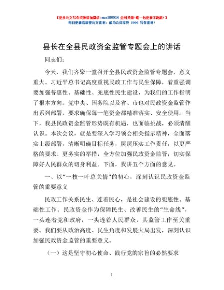 / 县长在全县民政资金监管专题会上的讲话