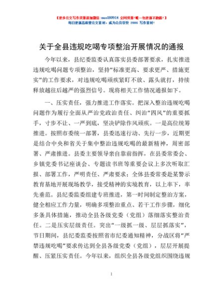 / 关于全县违规吃喝专项整治开展情况的通报