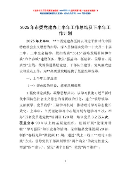 / 2025年市委党建办上半年工作总结及下半年工作计划