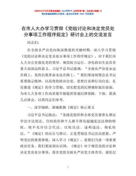 / 在市人大办学习贯彻《党组讨论和决定党员处分事项工作程序规定》研讨会上的交流发言