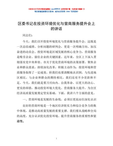 / 区委书记在投资环境优化与营商服务提升会上的讲话