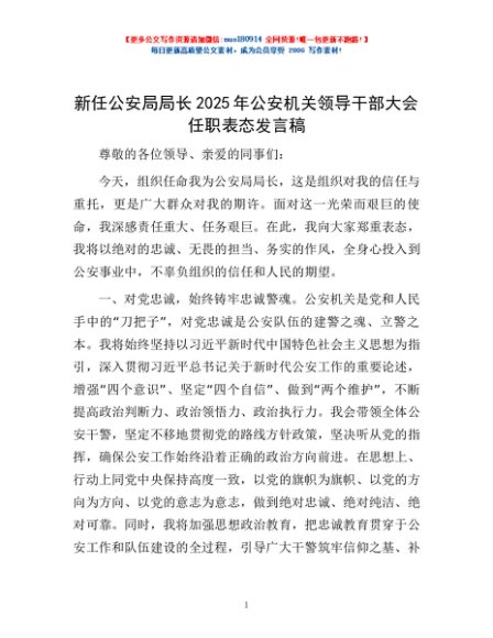 / 新任公安局局长2025年公安机关领导干部大会任职表态发言稿