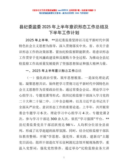 / 县纪委监委2025年上半年意识形态工作总结及下半年工作计划
