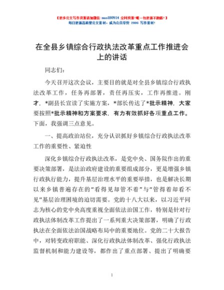 / 在全县乡镇综合行政执法改革重点工作推进会上的讲话