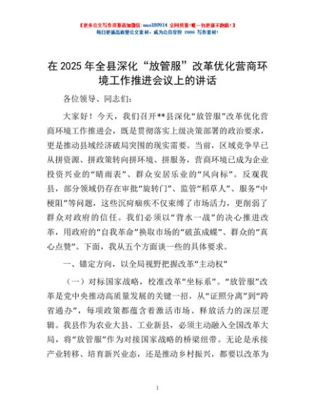/ 在2025年全县深化“放管服”改革优化营商环境工作推进会议上的讲话
