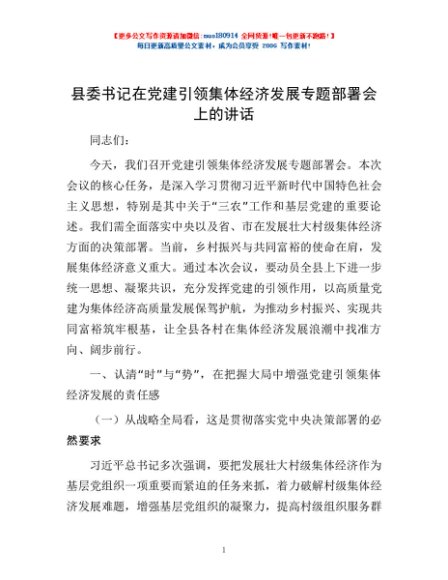 / 县委书记在党建引领集体经济发展专题部署会上的讲话