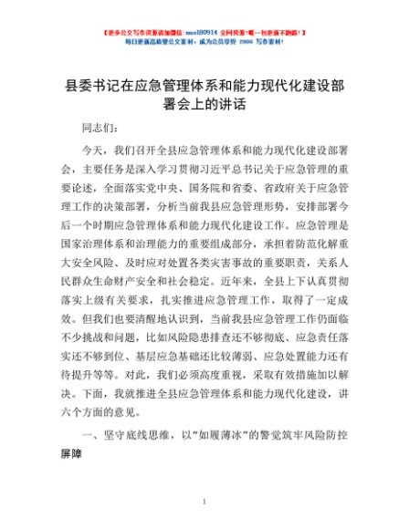 / 县委书记在应急管理体系和能力现代化建设部署会上的讲话